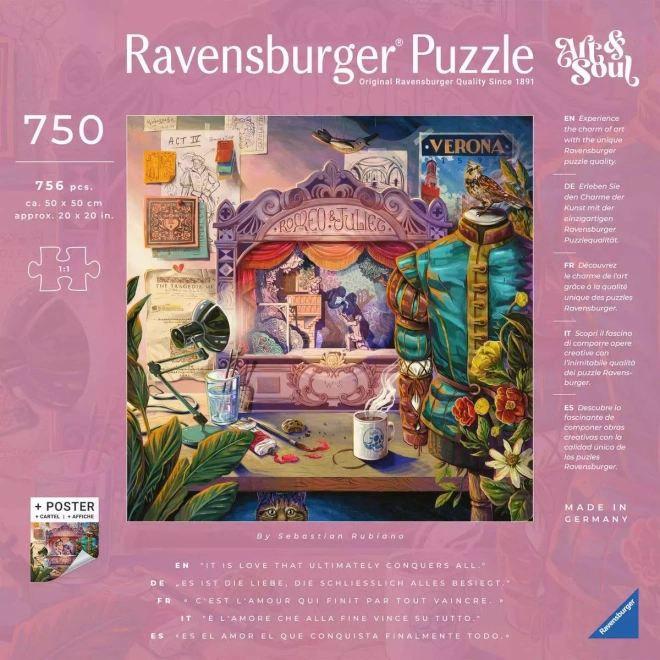 Otkrijte čaroliju kolekcije RAVENSBURGER Art & Soul s jedinstvenim kvadratnim puzzlama Romeo i Julija. Vrhunska kvaliteta dijelova, praktičan format 50 × 50 cm i priloženi plakat 1:1 za udobno slaganje oduševit će svakog ljubitelja puzzli. Stilski dizajn talentiranih ilustratora i ekološko pakiranje čine ove puzzle izvrsnim poklonom i opuštajućim doživljajem.