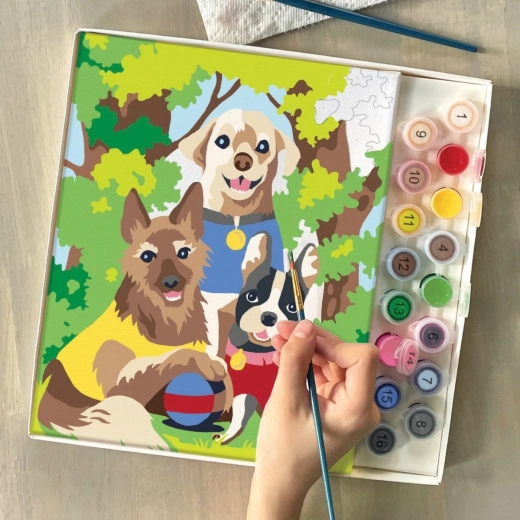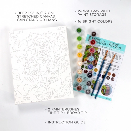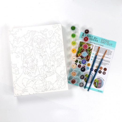 Ovaj set za slikanje po brojevima korak po korak pomaže vam stvoriti šarenu scenu triju pasa u šetnji. Numerirana polja na platnu odgovaraju brojevima na posudicama s bojom, pa točno znate gdje koji ton pripada. Slikanje je opuštajuće, zabavno i prikladno za početnike i djecu.