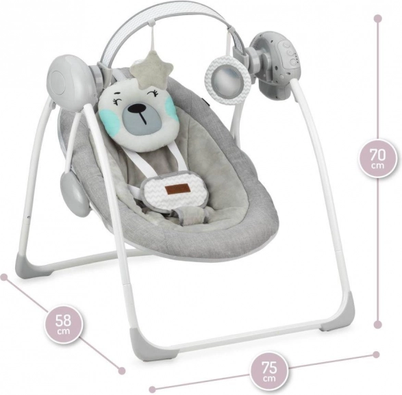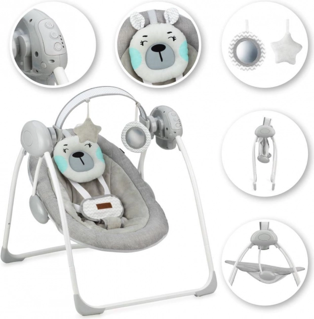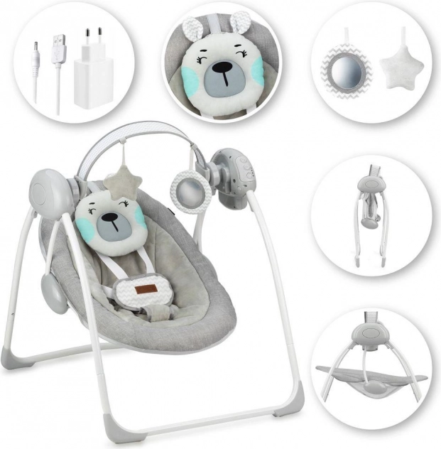 Nosivost sjedala prikladna je od rođenja do 9 kg. Naslon sjedala može se podesiti u 3 položaja nagiba, a njihalica nudi 5 različitih brzina njihanja. Ležaljka se napaja baterijama – koje traju do 180 sati. Konstrukcija je vrlo stabilna, ima protuklizne nožice, a sjedalo je opremljeno peterotočkovnim pojasevima s prekrivenom kopčom.