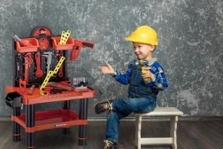 Ovaj radni stol uključuje brojne zabavne i korisne detalje. Donja polica je namijenjena za alat ili zalihe, dok radna ploča ima otvore za vijke i spojke. Također dolazi sa steznom klupom, što je neophodan element za svakog "vještog" dječaka! Organizacija je važna, stoga stol ima elemente za sortiranje i određrena mjesta za svaki alat.