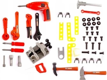 Set sadrži više od 50 dijelova: akumulatorsku bušilicu, steznu klupu, pilu, čekić, sjekiru, kliješta, gumeni čekić, odvijač, ključ i druge dodatke kao vijci, matice, spojke i kuke.