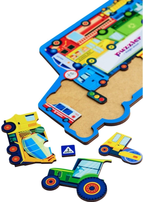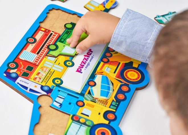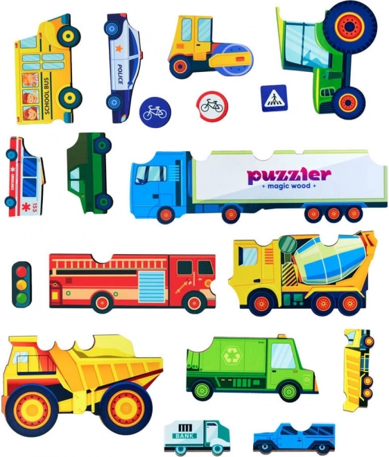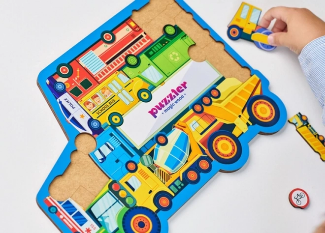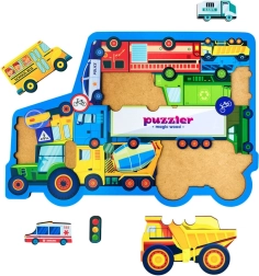 Drvene puzzle s temom prometa donose djeci učenje kroz igru. Svaki od 18 dijelova predstavlja posebno vozilo ili prometni znak, zahvaljujući čemu djeca vježbaju prepoznavanje oblika, rječnik i strpljenje. Čvrsta drvena izrada jamči dug vijek trajanja i sigurnu manipulaciju za male ručice.