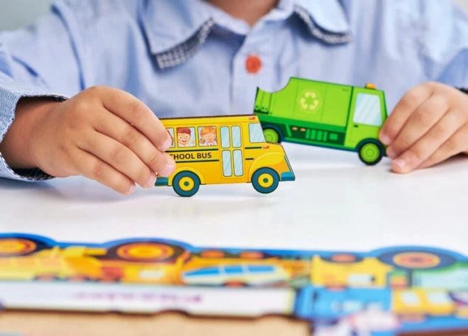 Svaki dio prikazuje različito prijevozno sredstvo ili znak, pa djeca lako usvajaju nove pojmove i proširuju rječnik.