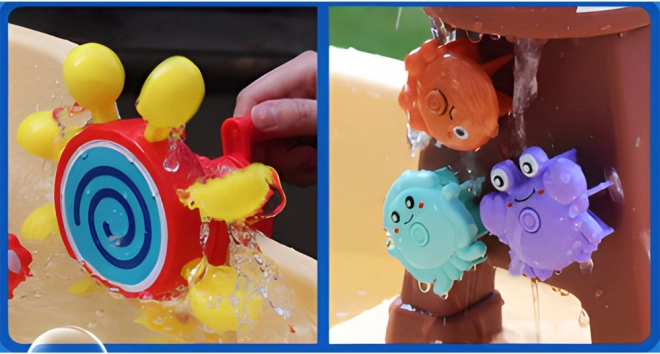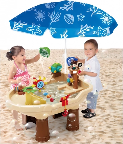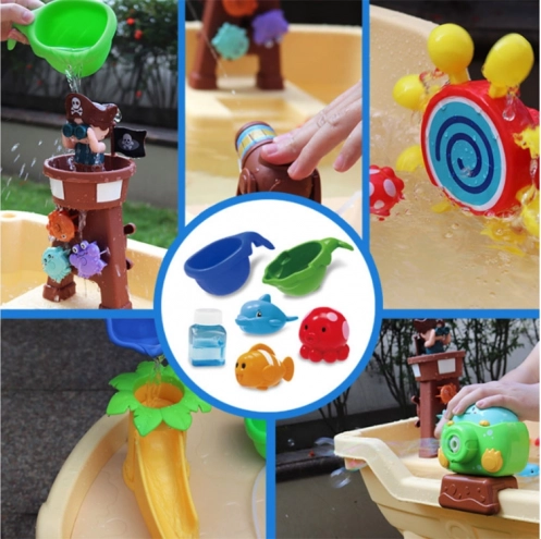 Ovaj gusarski vodeni stolić idealno je središte igara na svježem zraku. Djeca mogu uživati u vodenim eksperimentima, stvarati dugine mjehuriće, pucati iz vodenog topa i promatrati kako voda pokreće zupčanike i slatke životinjice. Stolić potiče kreativnost, znatiželju i koordinaciju oko–ruka.