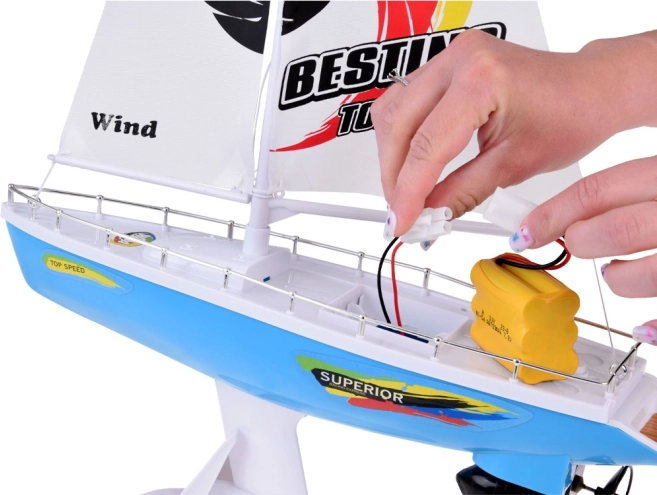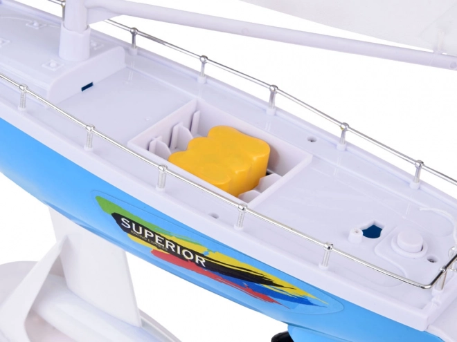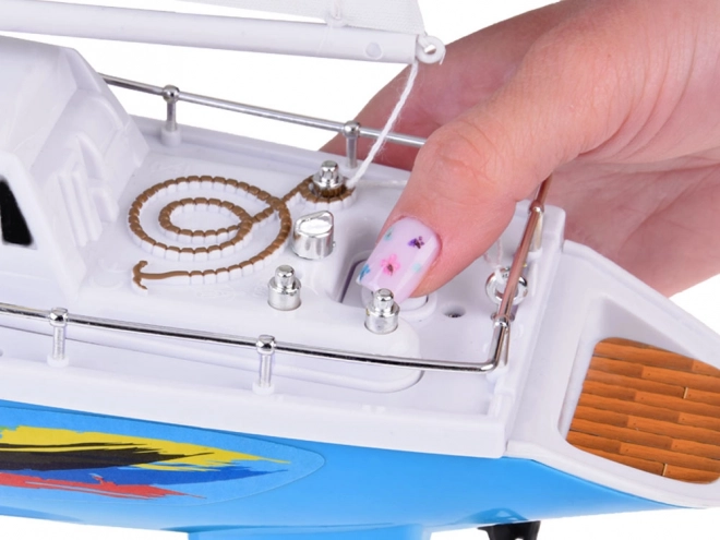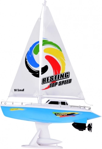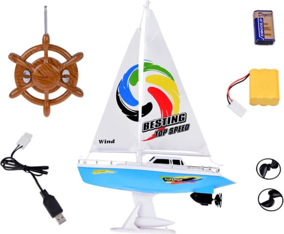 Stilovna RC jedrilica u plavo-bijeloj boji s realističnim jedrima donosi djeci puno zabave na vodi. Upravljanje osigurava upravljač u obliku kormila na frekvenciji 27 MHz, prisutni su dvostruki brodski vijci, stabilizacijska kobilica, kromirani relinzi i stalak za izlaganje. U pakiranju se nalaze punjiva baterija, USB kabel i rezervni propeleri.