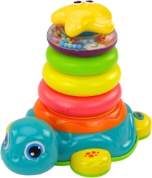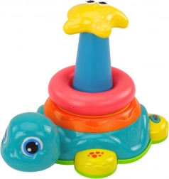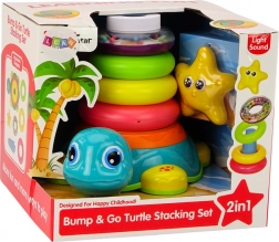 Piramida Vozeća kornjača 2u1 dinamična je igračka koja spaja zabavu i učenje. Baza u obliku vozeće kornjače reagira na prepreke i pruža svjetlosne i zvučne efekte, čineći igru interaktivnijom.