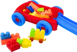 Lagana plastična kolica s kockicama u plavo‑crvenoj izvedbi djeca lako vuku pomoću praktične ručke. Šareni elementi potiču kreativnost i finu motoriku, a sve se dodatno praktično sprema u kolica. Sigurnost potvrđuju certifikati CE i EN71, idealno od 3 godine.
