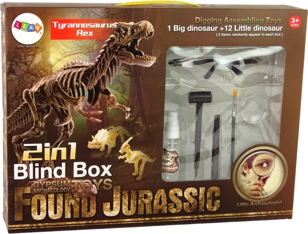 Alati u kompletu omogućuju otkrivanje kostura velikog dinosaura i dvaju manjih. Dva kamena i dvostruko više zabave. Dva manja kostura prekrivena su velom tajne. Nakon čišćenja kostiju, pribor iz kompleta pomoći će vam otkriti koji se dinosaurus skrivao u stijeni.