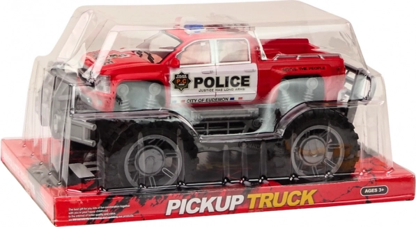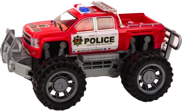 Crveni policijski pickup vjerno podsjeća na pravi interventni automobil. Velika crna kola osiguravaju odličnu prianjivost na različitim podlogama, dok inercijski pogon omogućuje vozilu da nakon okretanja stražnjih kotača krene naprijed. Karoserija s natpisom „POLICE“ i rotirkama na krovu pojačavaju autentičan izgled.