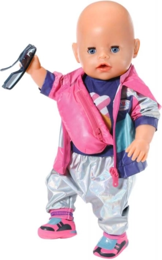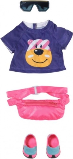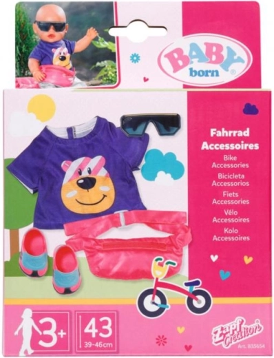 Stilizan set za male biciklistice pretvara svaku vožnju u zabavu. Sadrži majicu, protuklizne cipele, ružičnu torbicu za oko struka i sunčane naočale za lutku BABY born 43 cm. Lako se odijeva, potiče kreativnu igru i nadopunjuje svaku opremu za izlet.