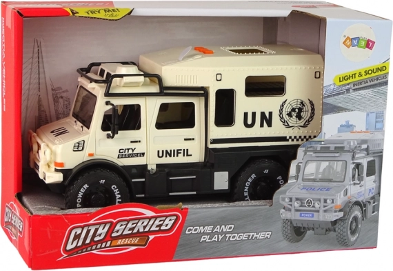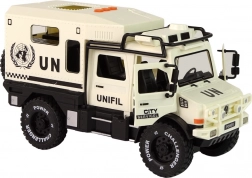Ovo robusno terensko vozilo u elegantnoj bež boji donosi mnogo akcije i zabave. Pritiskom na jednu od triju tipki na krovu zasvijetlit će prednja LED svjetla i oglasit će se zvukovi sirene, koji pojačavaju realističan doživljaj igre. Otvarajuća vrata potiču kreativne priče i razvijaju dječju maštu.