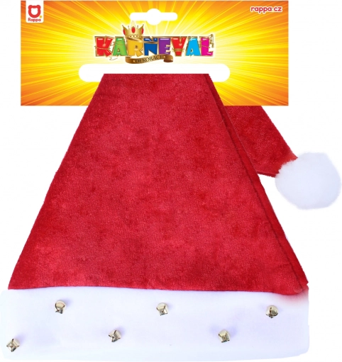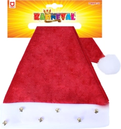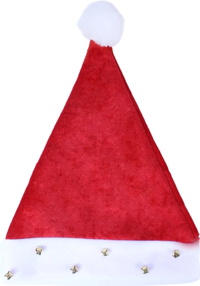 Stilistička božićna kapa s bijelim rubovima, ukrašena zvončićima i pompom. Idealna za božićne zabave.