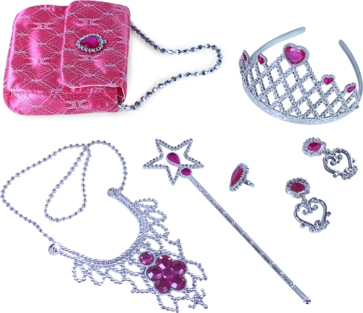 Ekskluzivni set za male princeze s krunom, naušnicama, ogrlicom, čarobnim štapićem i torbicom u elegantnoj ružičastoj izvedbi. Savršen dodatak kostimu i igri uloga princeze, prikladno od 3 godine.