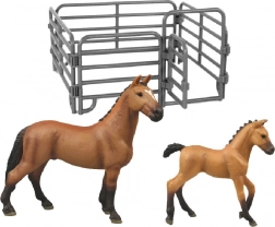 Idealni set za ljubitelje konja sadrži figuricu konja i ždrjebeta u impresivnoj smeđoj boji s bijelom mrljom, upotpunjeno ogradom.