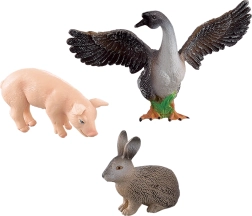 Sadrži tri realistične plastične figurice: prase, zečića i gusku s raširenim krilima, izrađene u prirodnim bojama.