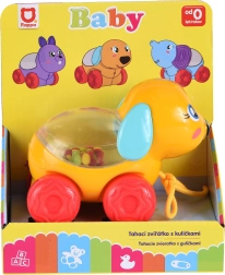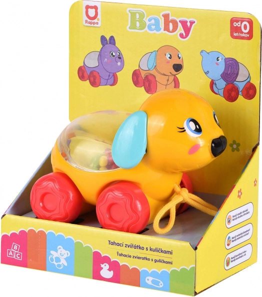 Slatki povlačni psić na kotačićima donosi djeci puno zabave i kretanja. Tijekom povlačenja ili vožnje unutar prozirnog bubnja poskakuju šarene kuglice koje potiču vizualnu percepciju i motoriku. Idealna igračka za prve korake i aktivnu igru.