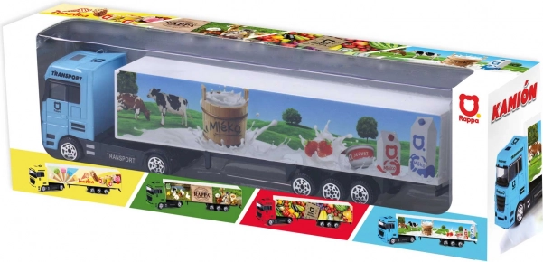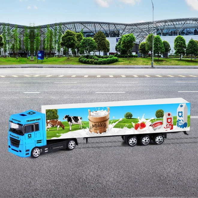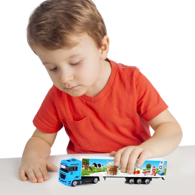 Metalni kamion s cisternom za mlijeko 1:87, duljina oko 20 cm. Izdržljiva izrada, PVC prikolica i slobodan hod. Odlično za djecu i kolekcionare.