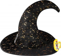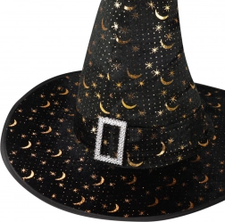 Stvorite savršen čarobnjački kostim s ovim elegantnim šeširom u klasičnoj crnoj boji. Široki obod i šiljati oblik daju autentičan izgled, dok se zlatne zvijezde i polumjeseci lijepo presijavaju i naglašavaju mističnu atmosferu. Ukrasna kopča pri osnovi stošca daje dodatni šarm.