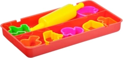 Set uključuje raznobojne plastične kalupe različitih oblika i lagani žuti valjak kojima djeca lako razvaljaju i izrežu savršene motive.