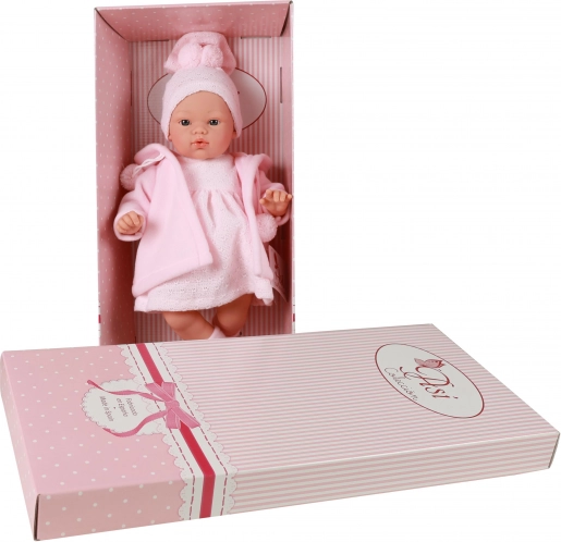 Lutka je odjevena u stilski ružičasti set: pletena haljinica, topli kaputić na vezanje s pomponima, pletena kapica i meke čarapice. Pakirana je u elegantnu poklon-kutiju, stoga je idealna kao poklon za djecu od 3 godine.