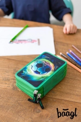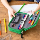 Tropatna školska pernica s dizajnom nogometne lopte nudi ekstra prostor za sve pisane potrepštine, uključujući jake pastele i flomastere, zahvaljujući prilagođenim gumicama. Opremljen je kvalitetnim patentnim zatvaračima i ima ojačani hrbat za jednostavno rukovanje.