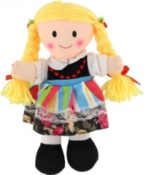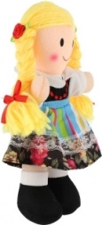 Lutka je obučena u šarenoj nošnji s cvjetnim uzorcima, što je čini veselim i šarenim društvom.