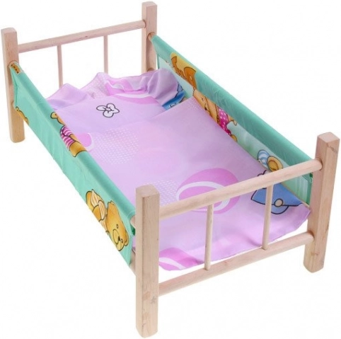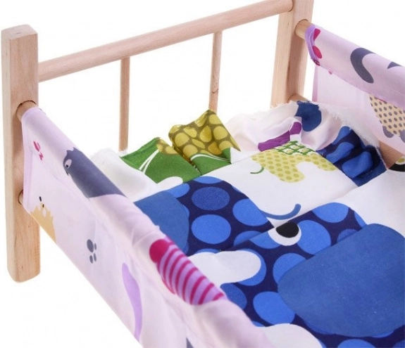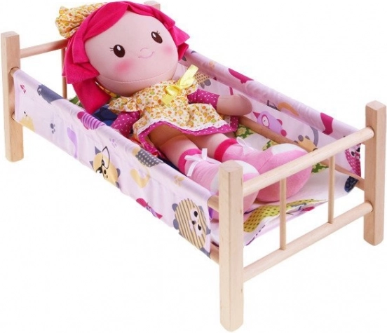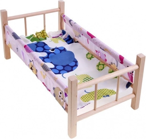 drveni krevetić za lutke maksimalne visine 50 cm savršen je dodatak za svaku malu mamu. Krevetić je izrađen od prirodnog neobojenog drva s tekstilnim bočnim stranicama i podlogom. U kompletu se nalazi i jastučić i pokrivač, idealni za lutku ili medvjedića.