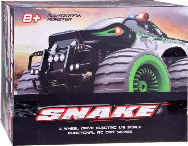 Monster Snake je masivan RC monster truck u mjerilu 1:8, koji se nosi s terenom i oštrim zavojima. Dvostruki motor klase 390, izdržljiva PVC karoserija i veliki EPP kotači promjera 22 cm osiguravaju stabilnost, trakciju i otpornost pri udarcima. Osvjetljenje i glazbeni efekti svakoj vožnji daju show.