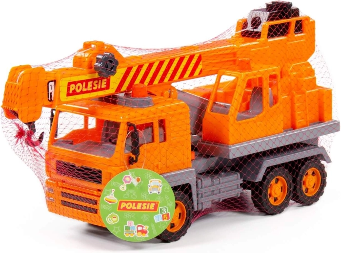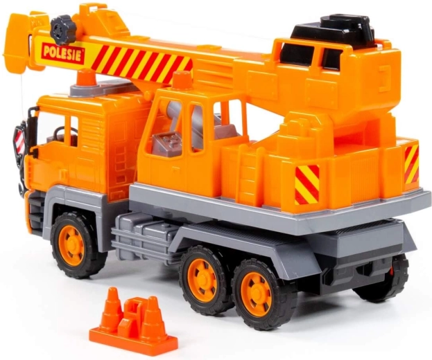 Serija specijalnih strojeva "Dijamant" na zamašnjak proizvođača Polesie uključuje glavne tipove vozila koja se u stvarnom životu koriste pri različitim radnim zadacima. Vozila imaju realističan izgled s naglaskom na detalje: tu su imitacije svjetala, svjetlosnih signala i tri para kotača na metalnim osovinama. Dizalica na kamionu opremljena je rotirajućom platformom i izvlačivom grabilicom s obješenu kukom. Kuku je moguće podizati i spuštati pomoću ručnog mehanizma. Igračka dodatno sadrži građevinske čunjeve koji igru čine zanimljivijom i potpunijom.