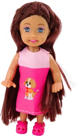 .Mala lutkica s tri psića u brlogu je preslatka i kompaktna igračka, idealna za djevojčice koje vole lutke i životinje. Lutkica je odjevena u šarenu, pažljivo izrađenu haljinu, a njezinu dugu smeđu kosu moguće je češljati i oblikovati po želji. Prate je tri mala psića u ležaljci, što igri daje još više zabave.