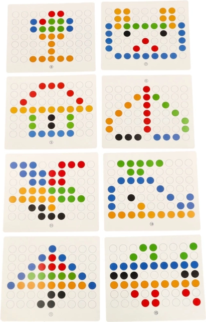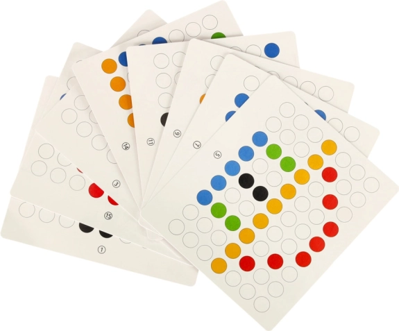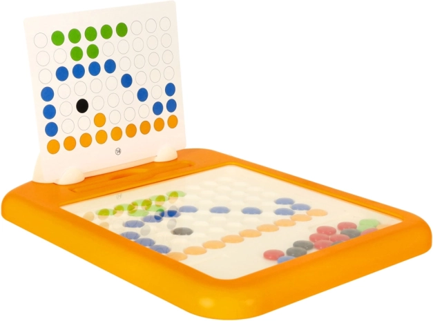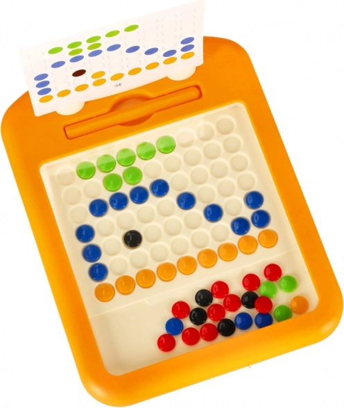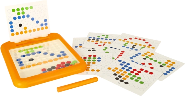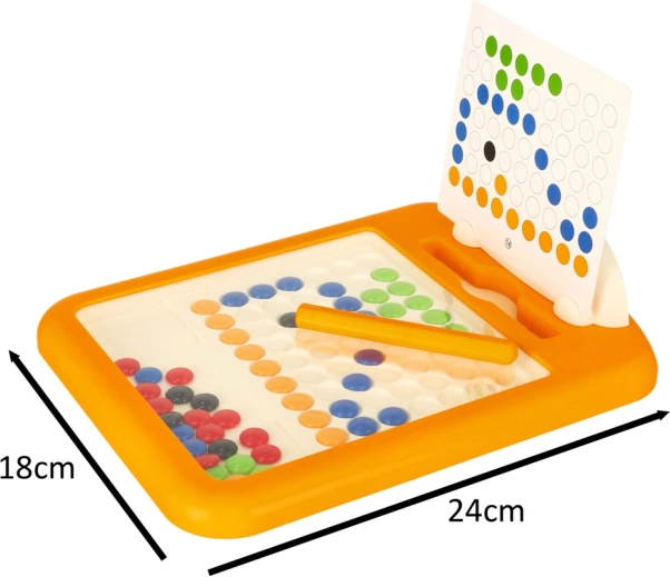 Zahvaljujući čvrstoj plastičnoj izradi i preglednom smještaju kuglica, igračka je idealna za dom, vrtić i putovanja. U setu je sve što je potrebno: ploča s integriranim kuglicama, 8 kartica s uzorcima i magnetska olovka.