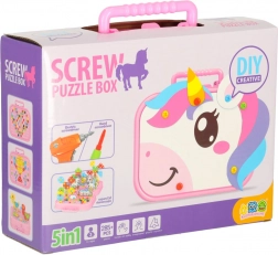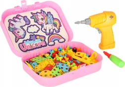 Prijenosna slagalica s motivom jednoroga u praktičnom ružičastom koferu donosi 285 dijelova za izradu 2D i 3D kreacija. Djeca će uživati u zavrtanju pomoću baterijske bušilice i odvijača, a pritom razvijati finu motoriku, kreativnost i strpljenje. Kompaktan kofer s ručkom idealan je za putovanja i uredno spremanje.