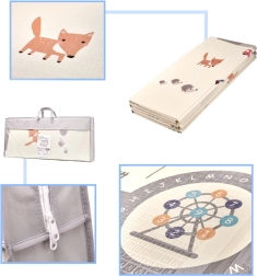 Dizajn podloge potiče maštu i učenje: s jedne strane simpatične životinjice i priroda, s druge strane ulice i raskrižja za sate zabave s autićima. Podloga se brzo sklapa i lako prenosi u priloženoj torbi s ručkom, ne zauzima puno mjesta, a održavanje je pitanje par sekundi – dovoljno je obrisati vlažnom krpicom.