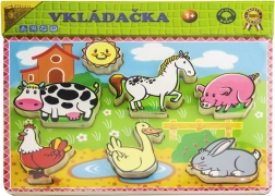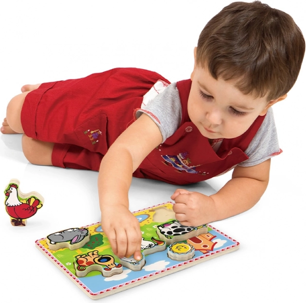 Šareni dječji puzzle-umetaljka s motivom seoskog imanja sadrži šest životinja i potiče razvoj mašte i pamćenja djece.