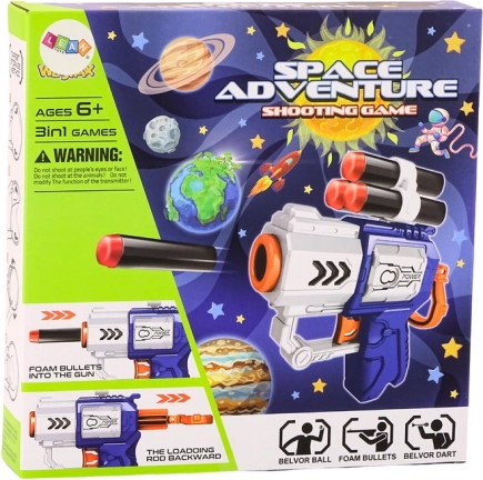 Igra Space Adventure pretvara svaku dječju sobu u malu streljanu s galaktičkim ugođajem. Velika tekstilna meta sa šarenim svemirskim motivom i jasno označenim vrijednostima bodova potiče precizno gađanje i učenje brojeva. Sigurni pjenasti metci i loptice s čičkom prianjaju na metu bez oštrih vrhova, pa se djeca mogu zabavljati bez brige.