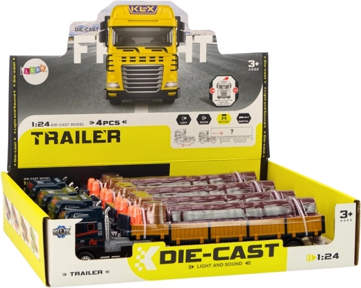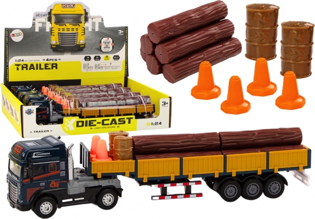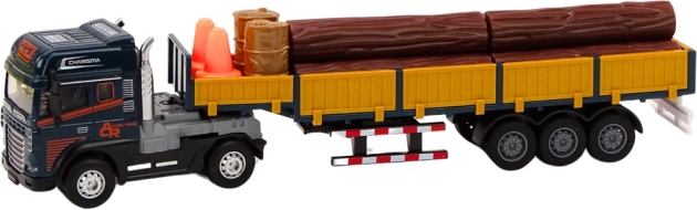 Realističan model kamiona u mjerilu 1:24 nudi plavu kabinu, odvojivu prikolicu s uklonjivim bočnim stranicama i teret u obliku drvenih trupaca. Za još zabavniju igru ima svjetlosne i zvučne efekte (pokretanje motora, vožnja unatrag) te mehanički pogon/zalet za vožnju. U kompletu su i prijenosne čunjeve te dva bačve za scenarije utovara i osiguranja “gradilišta”. Certifikacija CE, sukladno s EN71, prikladno od 3 godine.