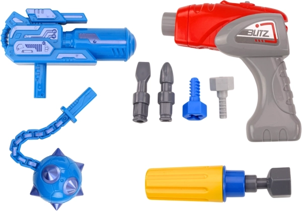 Sastavni dio je dječja bušilica i odvijač s izmjenjivim nastavcima koji savršeno pristaju dječjoj ruci. Plavo oružje i buzdovan daju igri dozu pustolovine i podupiru kreativno pripovijedanje. Igračka zadovoljava norme CE i EN71 te je pogodna za djecu od 3 godine naviše.