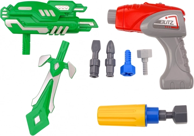 - Igračka bušilica s nastavcima, odvijač, mač i oružje