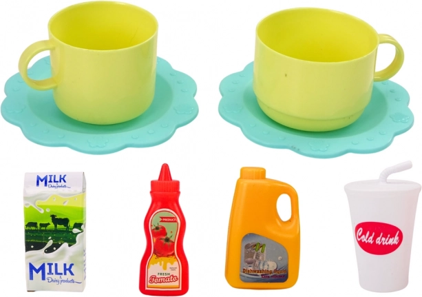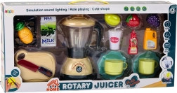 Zabavan kuhinjski set za najmlađe s električnim mikserom koji ima svjetlosne i zvučne efekte te funkciju okretanja. Djeca mogu u posudu ulijevati vodu i promatrati vrtloženje “koktela”, rezati voće s čičkom (na čičak) plastičnim nožem na dasci i poslužiti u dva šalice s podlošcima. Odličan izbor za razvoj fine motorike, mašte i igre uloga u sigurnoj izvedbi.