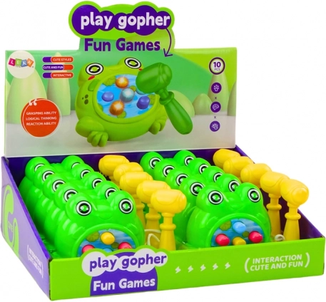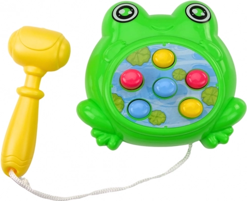 Mini igra u obliku zelene žabice je mobilna verzija klasika Whac‑a‑Mole: iz otvora se neočekivano pojavljuju mete, a zadatak je što brže ih pogoditi priloženim čekićem. Zahvaljujući kompaktnoj veličini lako je ponesete na izlet, piknik ili praznike.