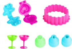 6 posudica modelirajuće mase, podloga u obliku torte, tanjurići, pribor za jelo, tlačnik s izmjenjivim nastavcima, 2 party kapice, upute