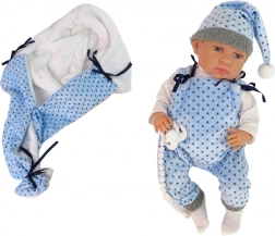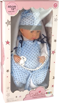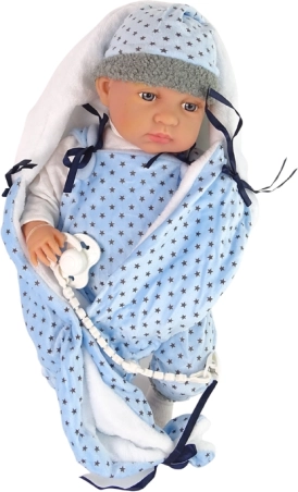 Ova lutka veličine 46 cm ima realističan izgled, s pokretnim rukama, nogama i glavom, što doprinosi doista autentičnom doživljaju igre. Mekani i ugodni materijali osiguravaju da je lutka ugodna na dodir. Dijete se može igrati s izmjenom odjeće, jer lutka ima lako izmjenjivu odjeću. Odjeća uključuje plavo-crnu pidžamu i dekicu s motivom zvijezda.