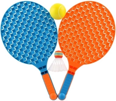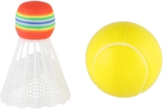Set uključuje lopticu i šarenu košaricu, što ga čini odličnim za soft tenis ili badminton.