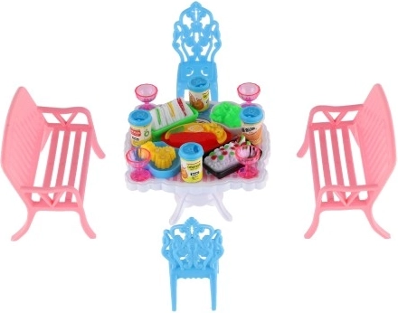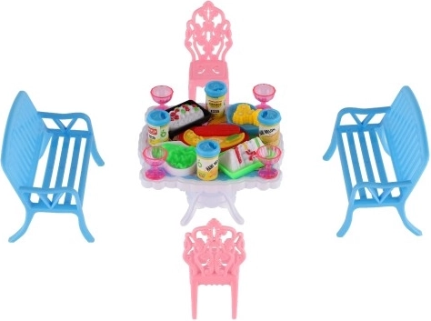 Set sadrži 2 klupe, 2 stolice i stol uz 13 komada dodataka – čaše, limenke, tanjure i pladanj. Sve potrebno za gozbu vaših lutaka.