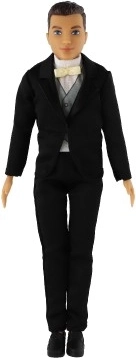 Crni smoking s bijelom košuljom i leptir-mašnom naglašava svečani stil. Lutak je spreman za veliki dan uz bok mladenke.