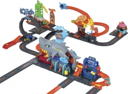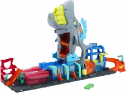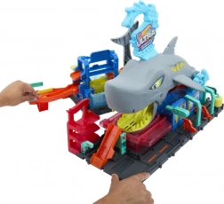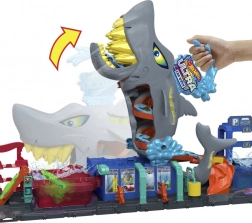 Otkrijte uzbudljive avanture s perionicom automobila Hot Wheels City, gdje dominantni morski pas uvlači vašu djecu u akciju. Uđite priloženim vozilom Color Reveal niz rampu ravno u otvorena usta morskog psa! Pritiskom na glavu morskog psa promijenite boju vode i promatrajte kako otkriva nove dekoracije na vašem vozilu.