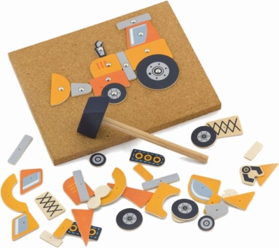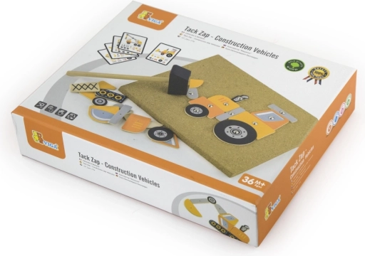Kreativna pluta čekić-naljepnica VIGA s građevinskim vozilima oduševit će male graditelje od 3 godine. Drveni oblici s otvorima pričvršćuju se na ploču pomoću čavlića i čekića – djeca razvijaju finu motoriku, logičko razmišljanje, kreativnost i koncentraciju. Set sadrži 45 dijelova, ploču od pluta, čekić, čavliće i kartice s uzorcima građevinskih strojeva.