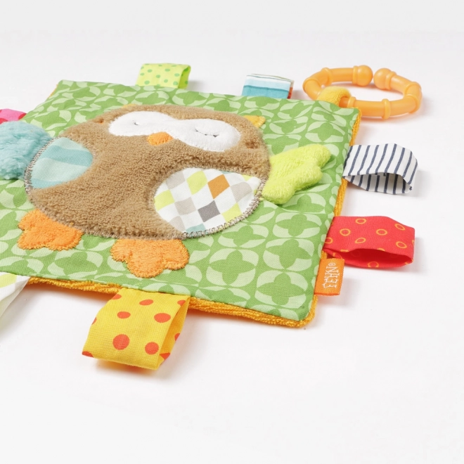 Ova preslatka tješilica izrađena je od mekih materijala ugodnih na dodir. Zahvaljujući visećem prstenu lako se pričvršćuje na autosjedalicu ili kolica, što olakšava korištenje na putu. Šareni, raznoliko teksturirani rub pruža djetetu ne samo vizualnu i taktilnu stimulaciju, već i umirujuće iskustvo.