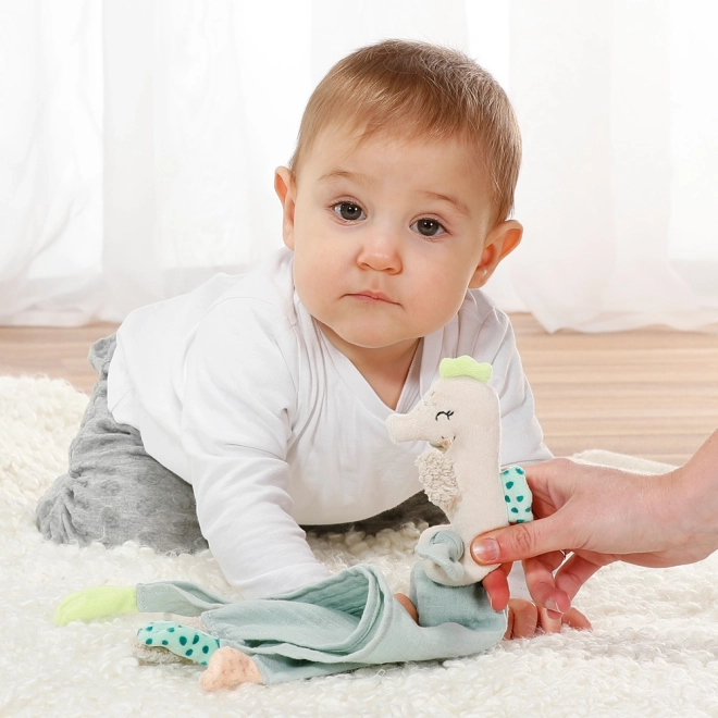 Pri uspavljivanju pamučna muslin tkanina pruža osjećaj sigurnosti. Ugodno mekani materijali, mala morska stvorenja i zavezani krajevi potiču dijete na vježbanje hvata.