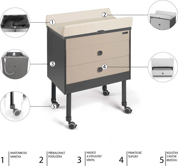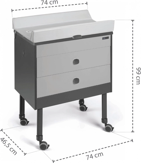 Stabilna konstrukcija s 4 gumirana kotačića s kočnicom i sustavom protiv prevrtanja jamči sigurnost pri svakodnevnoj uporabi. Dvije velike ladice primaju pelene, kozmetiku i dodatke. Zahvaljujući minimalističkom dizajnu i kompaktnih dimenzija komoda je odličan izbor i za manje interijere.